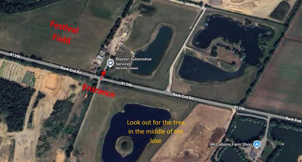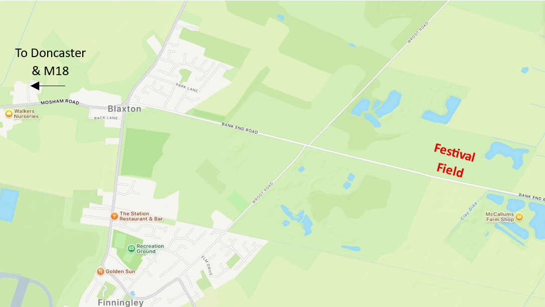 The festival is held at Old Bank End Farm, Bank End Road (B1396), DN9 3NT. The nearest village is Finningley.