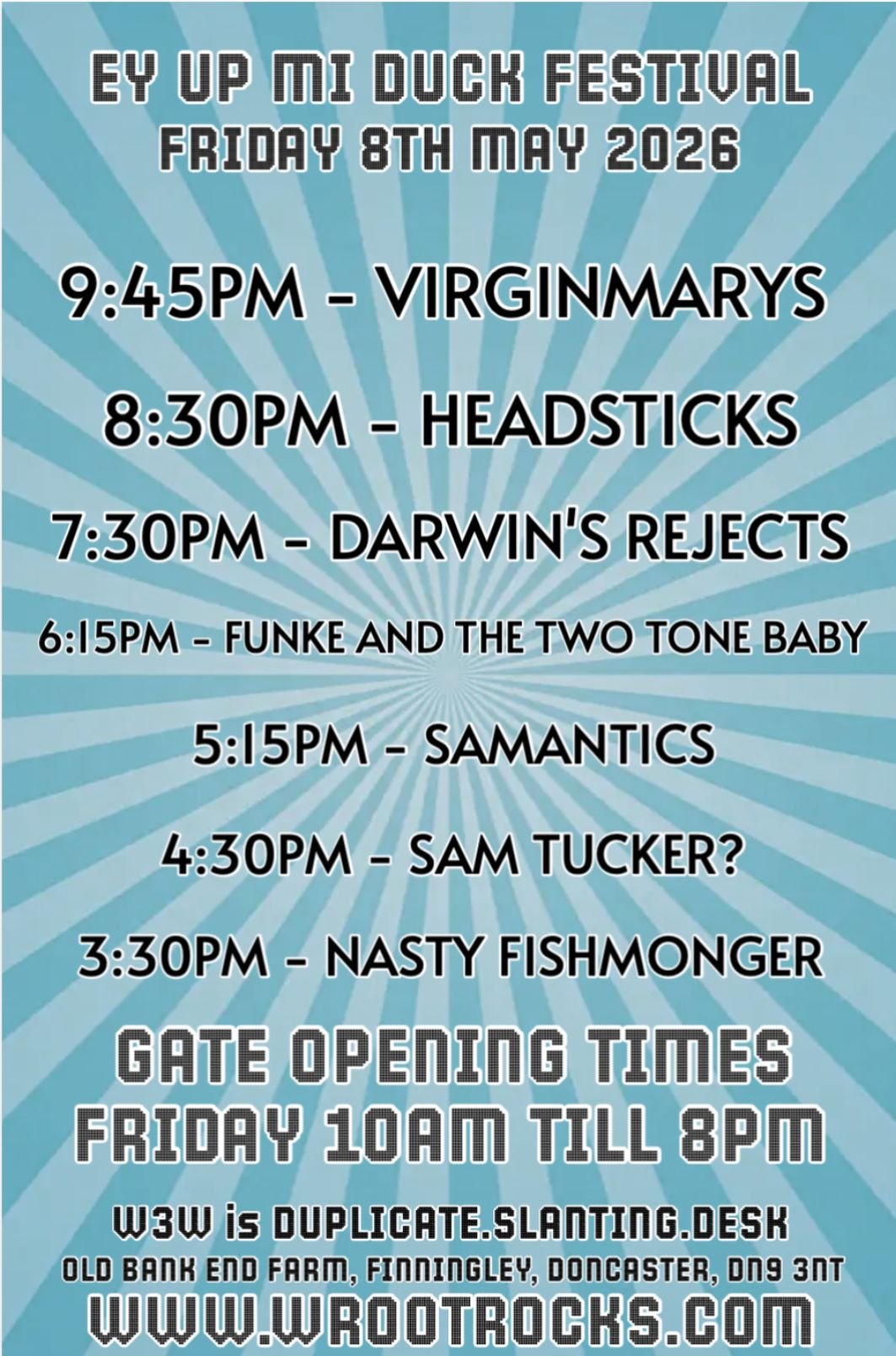 Next year’s Ey Up Mi Duck will be on 7th – 9th May 2027, and tickets go on sale straight after this year’s festival, on Monday 11th May at 10.00am. Tickets will be available on www.wrootrocks.com